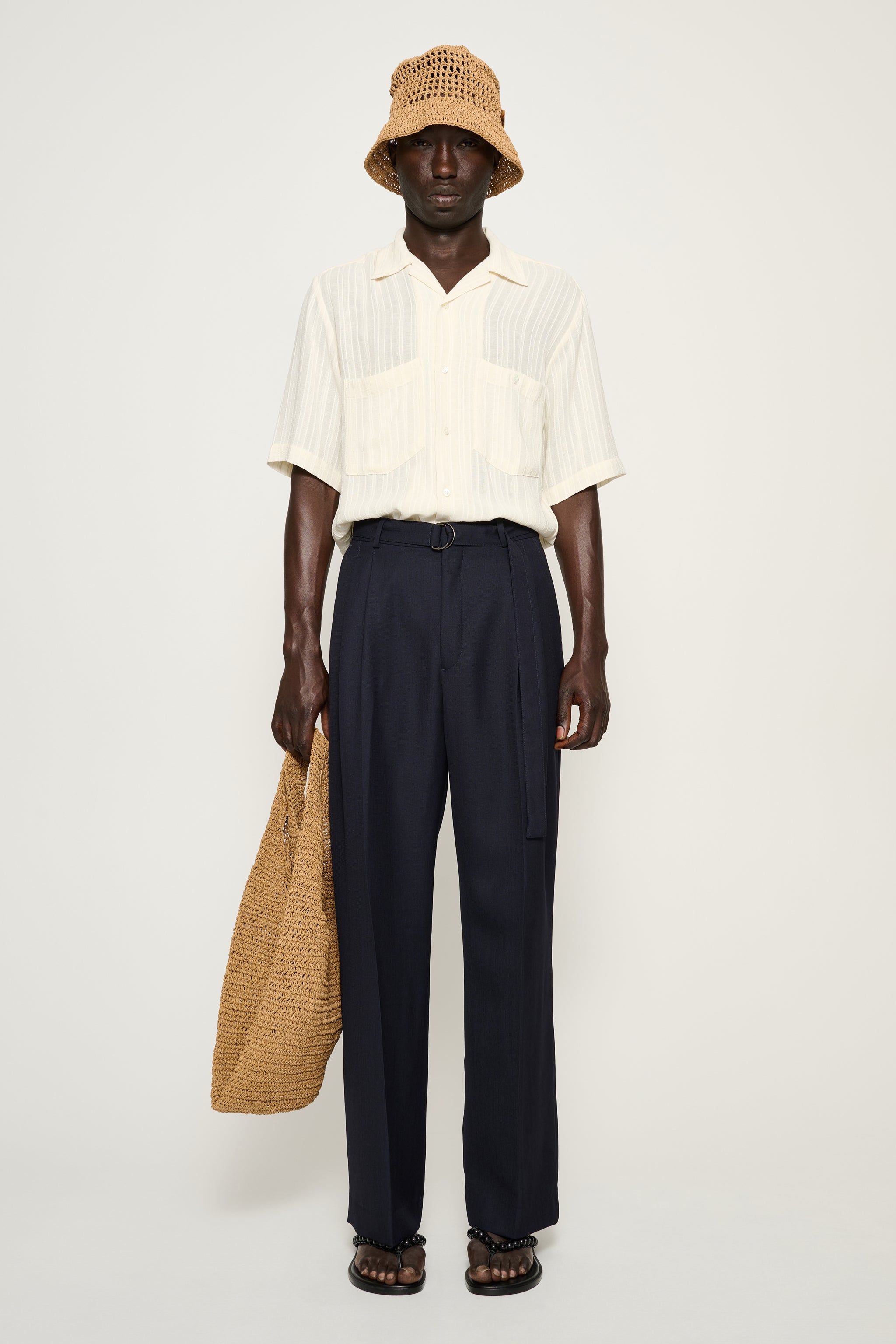 Omari are tailored trousers cut in a relaxed silhouette with a higher rise. Defined by twin front pleats that introduce volume through the leg, they balance structure with fluid movement. Crafted from a cool tropical wool woven in Italy, offering a lightweight, breathable hand feel with natural drape. Designed with slanted side pockets, twin back pockets and a self-fabric belt, finished with hand-stitched CS logo buttons.