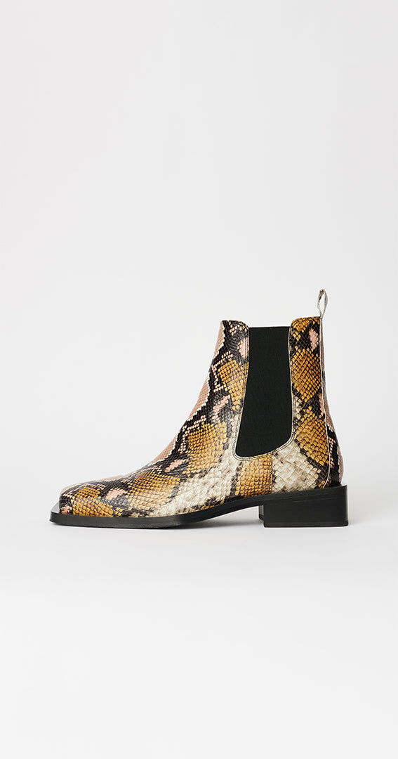 Rick 'Chelsea' style boot crafted from snake-effect leather, featuring a squared toe and stacked heel. Fully leather-lined with a leather outsole.