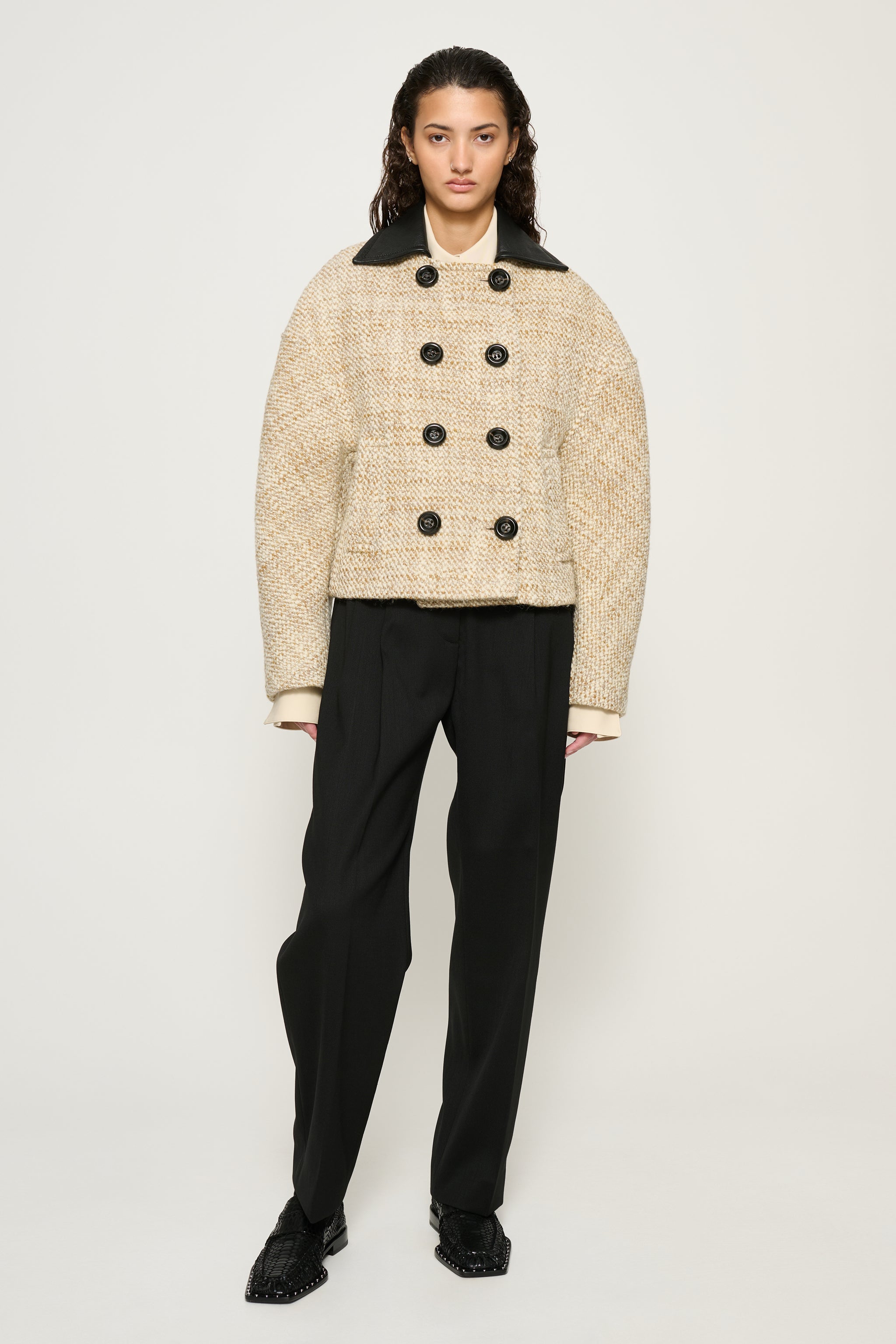 Cropped jacket cut in a rounded silhouette with a fitted waist, crafted from Italian textured wool bouclé. Designed with a contrast leather collar and finished with oversized buttons at the front for a bold yet refined look.