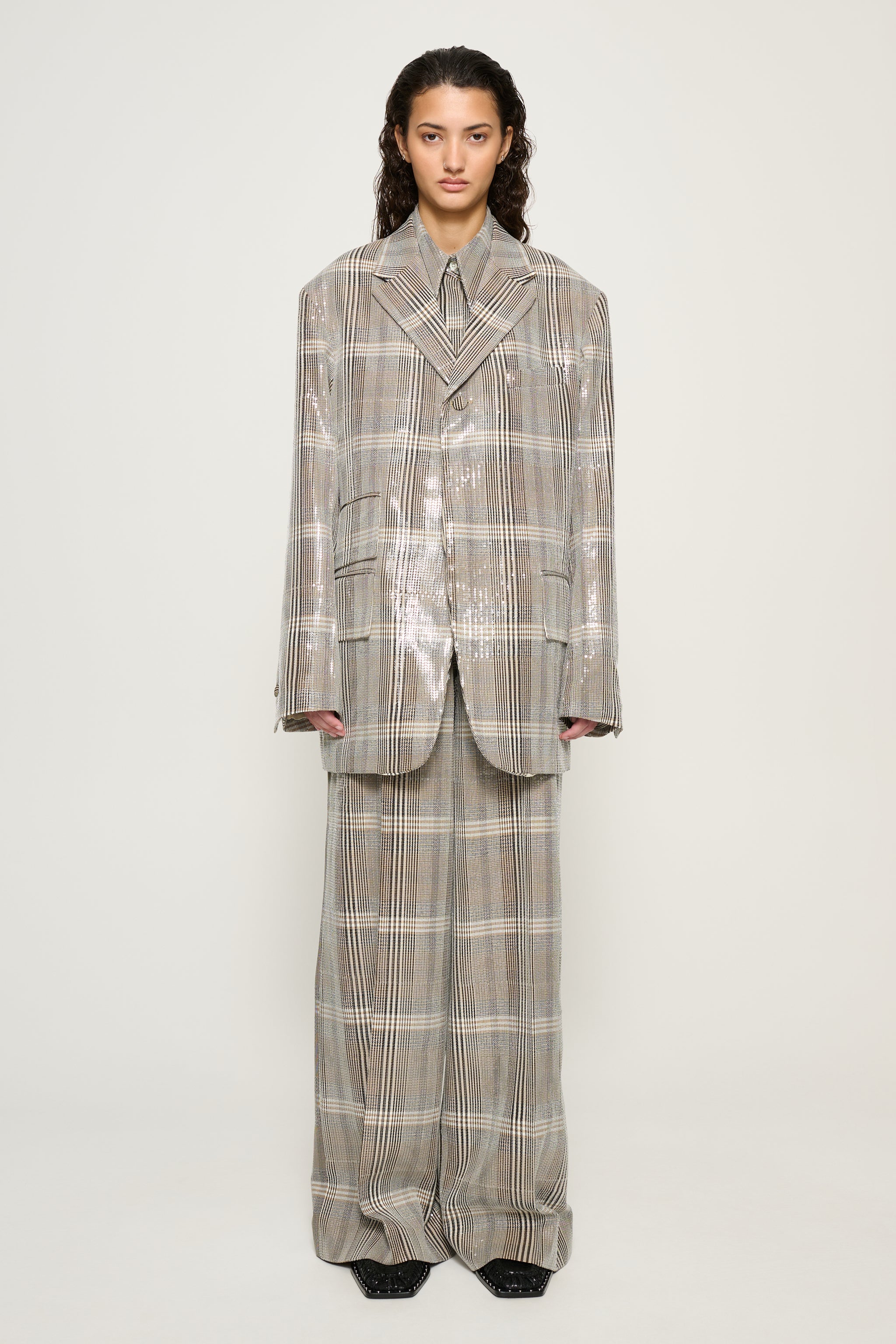 Single-breasted blazer with a relaxed, elongated fit, cut from a sequin-embellished check fabric. Features a three-button closure with a high break point, notch lapels, and only the top button left visible for a clean, modern finish.