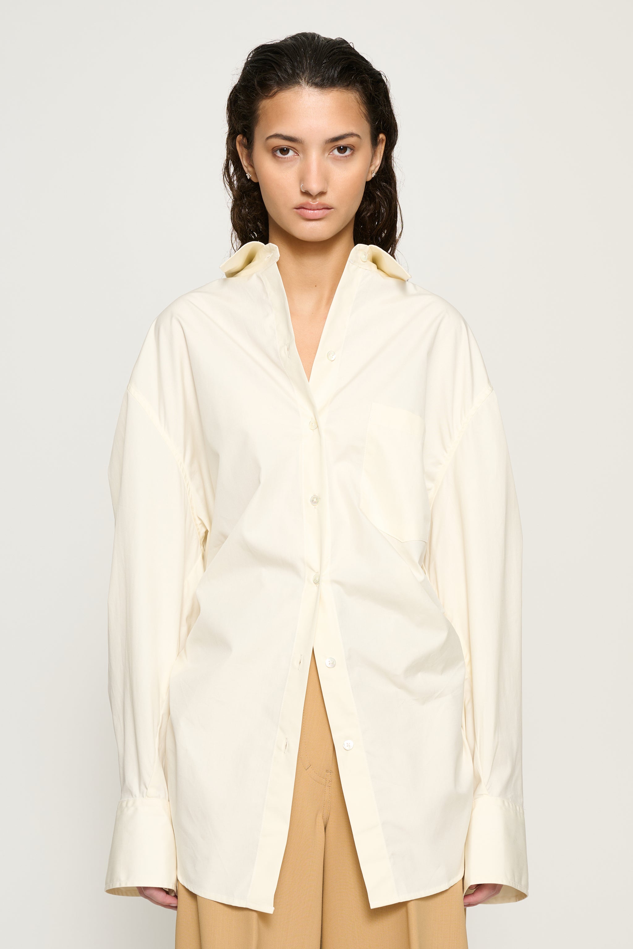 Shirt crafted from crisp cotton poplin, designed with an asymmetric construction and batwing sleeves that create a fluid, sculptural silhouette. The shape is intended to be worn high on the shoulder, allowing the drape to fall naturally around the body. A box pleat at the back adds volume and movement, enhancing the airy, expressive feel of the piece.