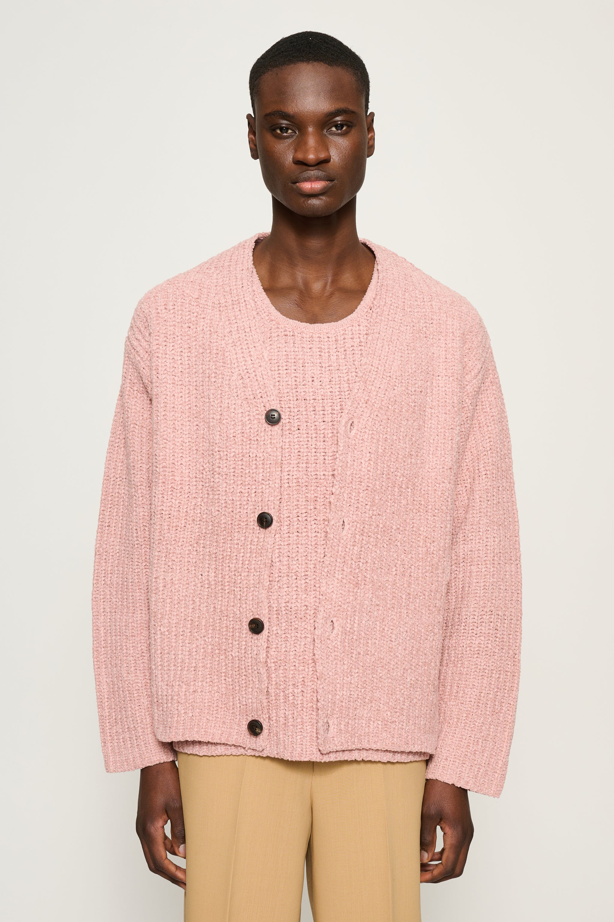 Relaxed-fit cardigan crafted from a soft Chenille yarn that offering a velvety texture and luxurious hand feel. Designed with a V-neck, long sleeves, and finished with a ribbed neckline and hem for a clean, refined silhouette.