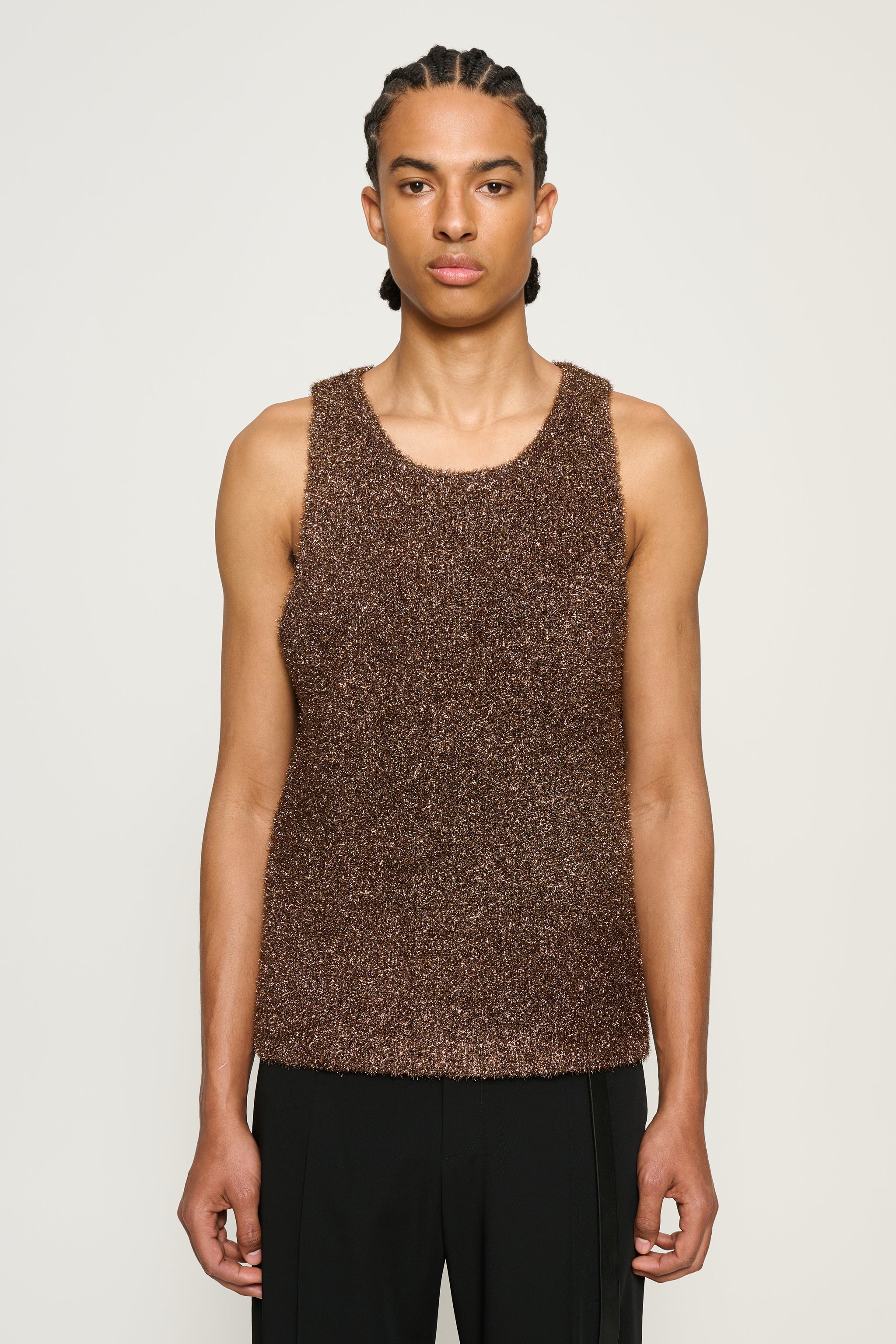 Relaxed tank top crafted from a soft lurex yarn, creating a metallic effect with soft texture. Designed for comfort and ease, it pairs perfectly with the matching cardigan for a coordinated, laid-back look.