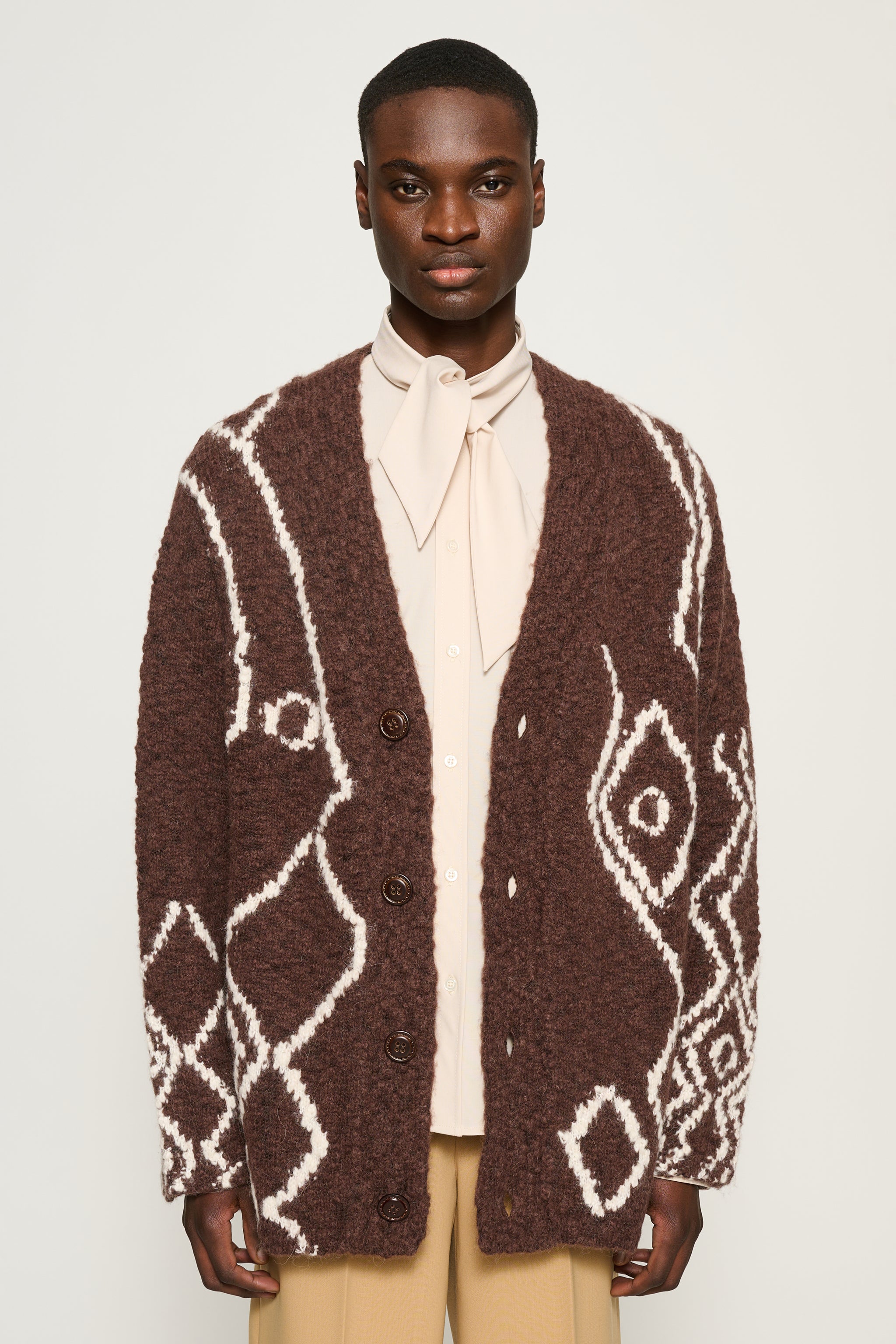 Relaxed-fit cardigan crafted from soft, textured alpaca-wool yarn. The design features an artwork motif inspired by traditional Beni Ourain rugs, finished with a CMMN SWDN embroidery on the back.