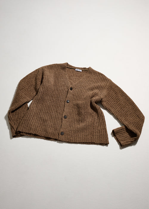 Relaxed-fit cardigan, crafted from a soft chenille yarn, offering a velvety texture and luxurious hand feel.