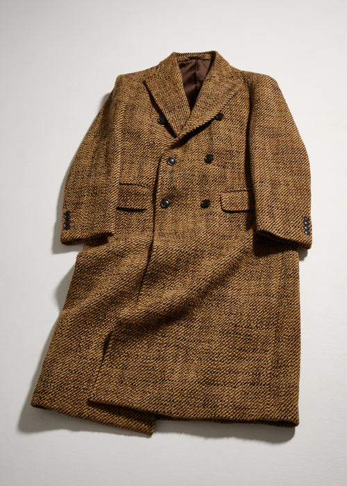 Double breasted coat, crafted from a rich Italian bouclé tweed. Featuring sharp shoulders, peaked labels and a single back vent.