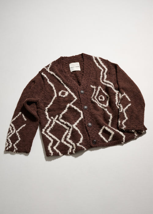 Relaxed-fit cardigan crafted from soft, textured alpaca-wool yarn. The design features an artwork motif inspired by traditional Beni Ourain rugs, finished with a CMMN SWDN embroidery on the back.