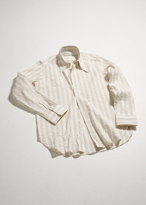 Pointed-collar longline shirt, crafted from alightweight Italian cotton–silk blendfeaturing asubtle barré stripe effect.