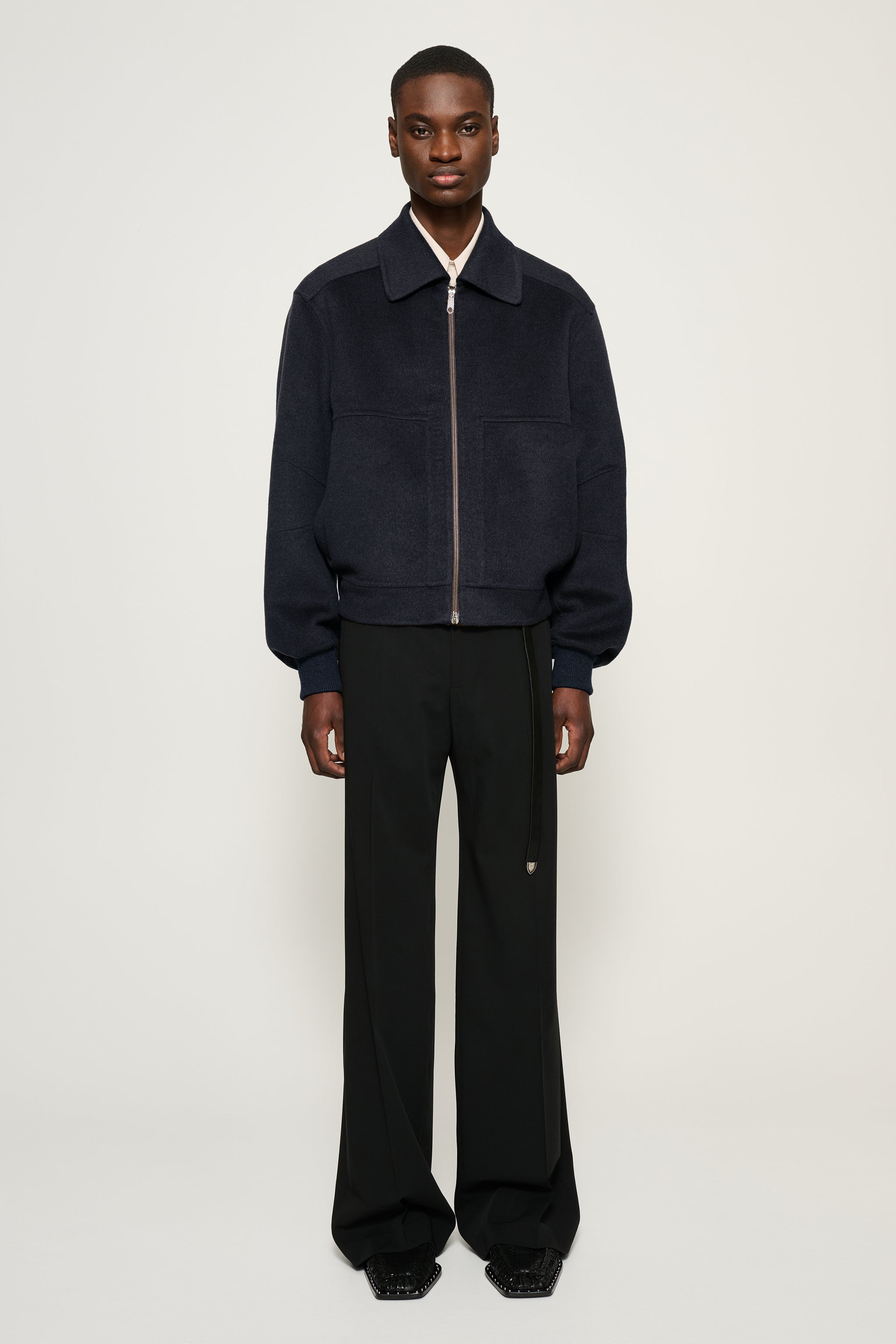 A double-face wool bomber jacket with zip front closure. With elasticated back hem, welt pockets and ribbed cuff.