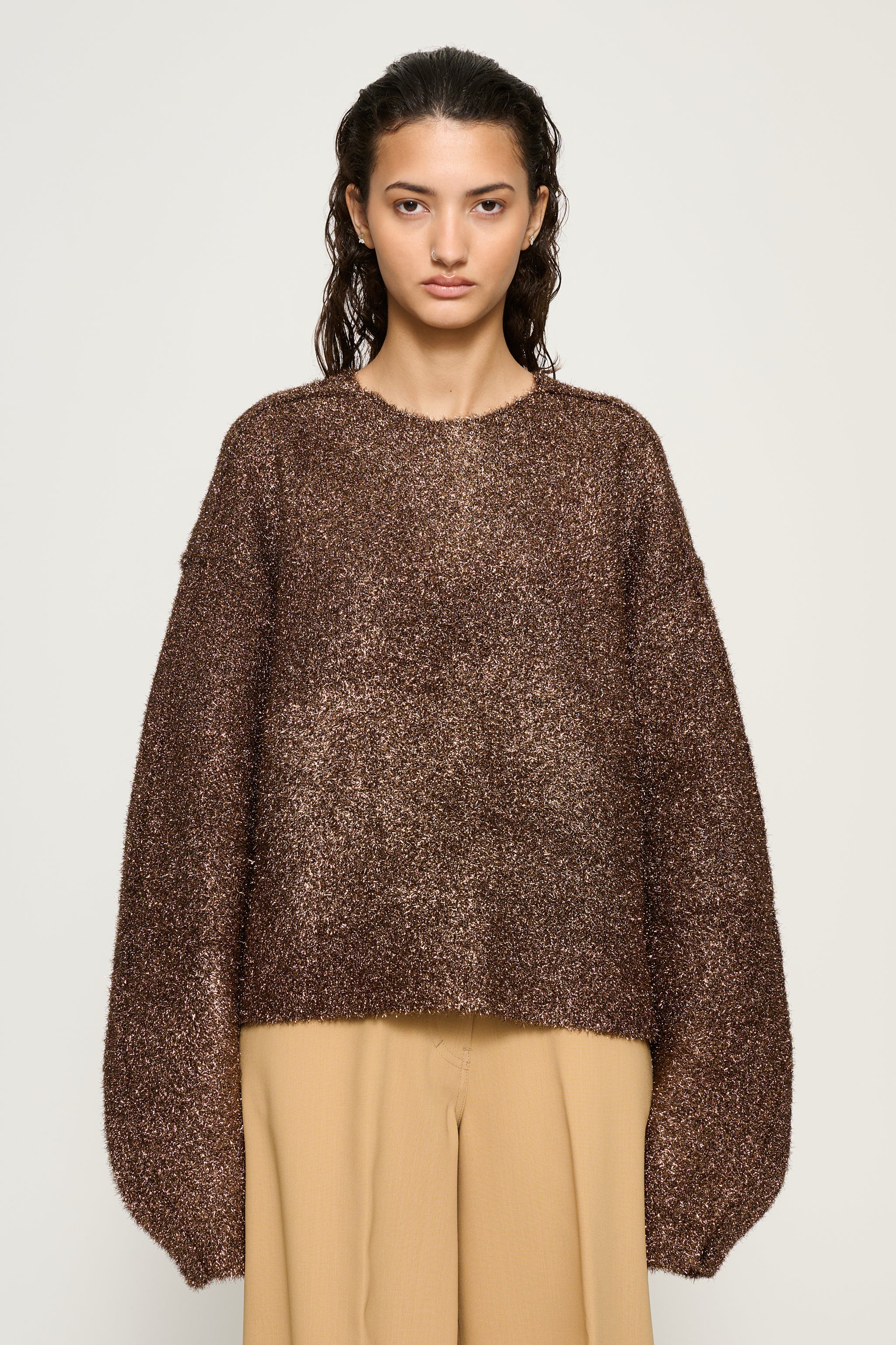 Structured double-face sweater crafted from metallic lurex yarn, creating an all-over glitter effect. Designed with sculptural round sleeves for a voluminous and expressive silhouette.