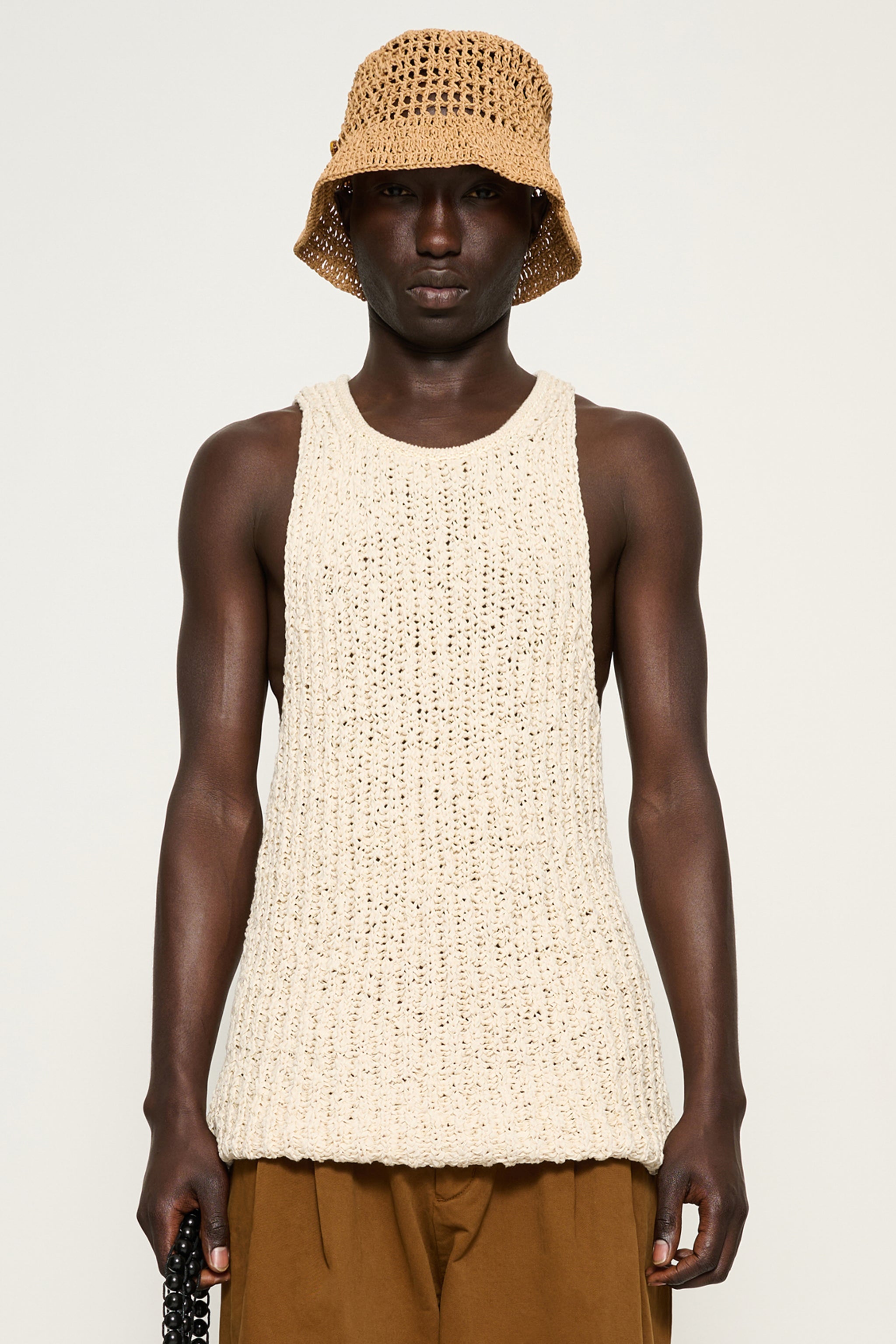 Eli is a relaxed-fit tank defined by an open knit construction. The silhouette remains clean and minimal, allowing the texture of the yarn to shape the piece. Knitted from a dry cotton tape yarn, offering structure with breathability.