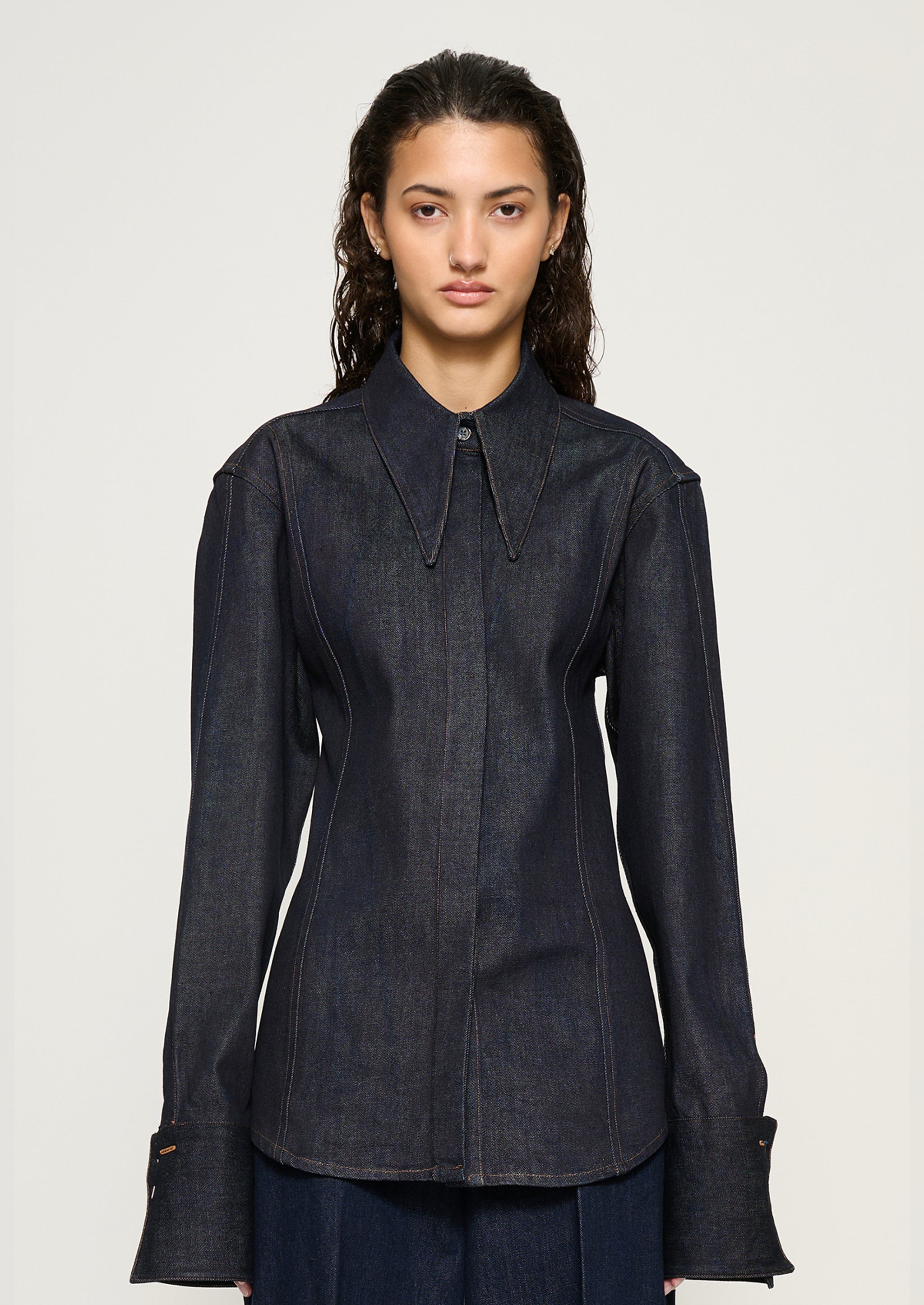Hourglass-cut shirt with a sharp pointed collar, dropped shoulders and a narrow waist. Made from premium cotton denim and finished with wide cuffs and a concealed front placket for a clean, refined look.
